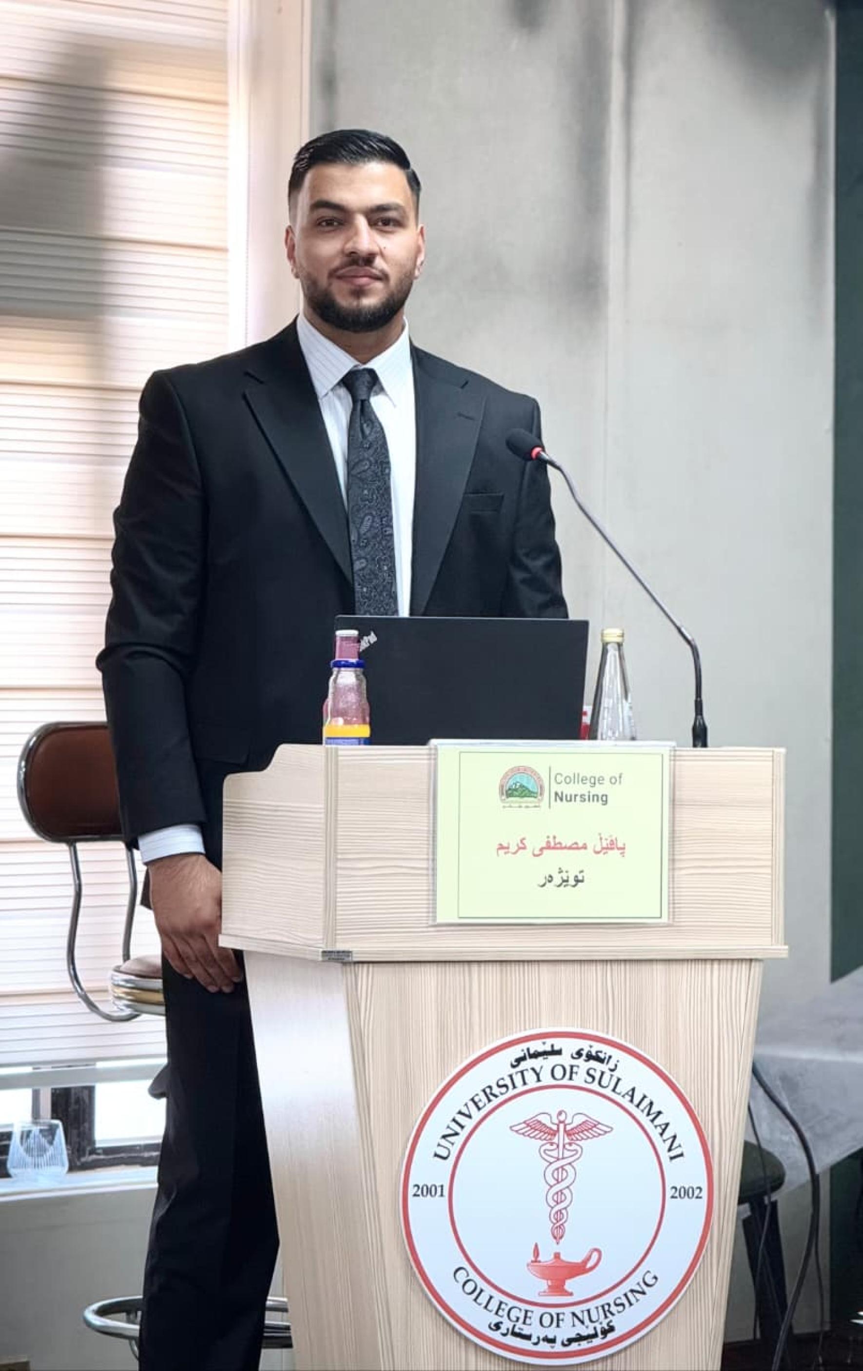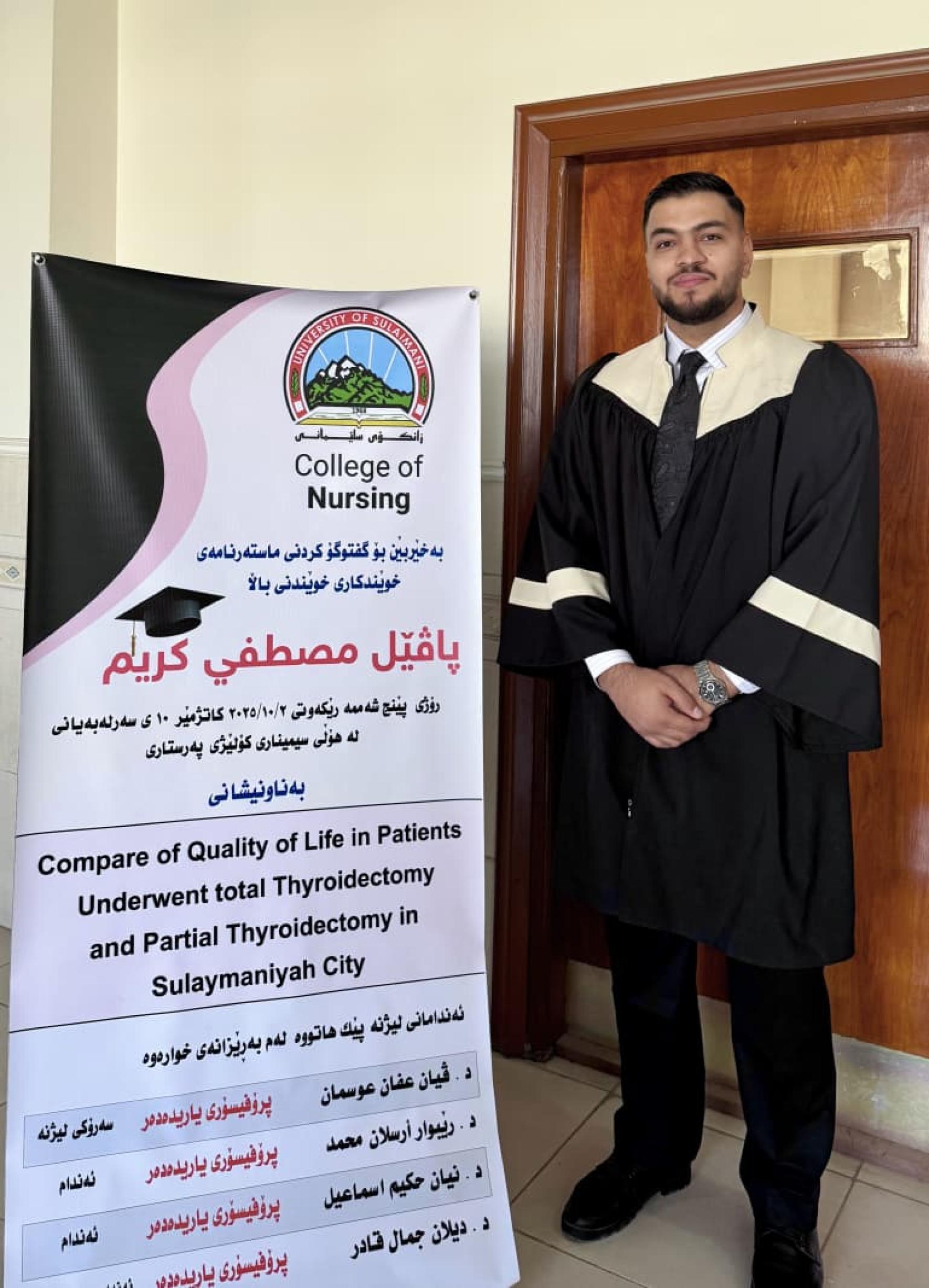 On October 2, 2025, at the University of Sulaimani / College of Nursing, his master’s thesis was examined, discussed, and approved after nearly three hours of defense.
